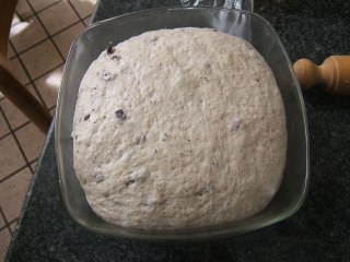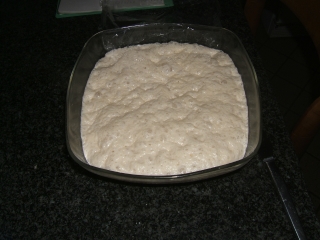 dopo 12 ore di lievitazione al coperto e sigillata con pellicola, si presenta cosi’: