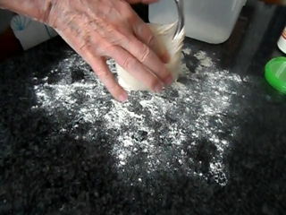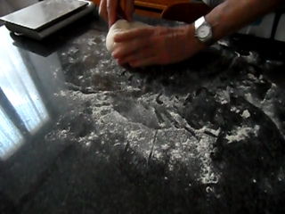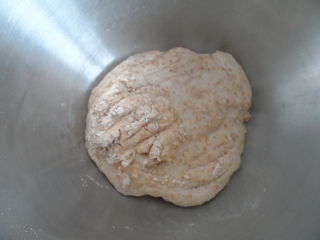 Impasto con il gancio a velocità minima fino a quando non inizia ad amalgamarsi, poi passo a velocità 2 (circa 100 giri al minuto). Quando l'impasto si è tutto raccolto sul gancio fermo, stacco dal gancio, aggiungo a spolvero il sale e riprendo ad impastare a velocità 2 per circa 6 minuti. Poi porto sul marmo, faccio un certo numero di pieghe, formo a pagnotta e metto in ciotola