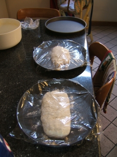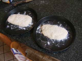 Rovescio lĠimpasto sul tavolo ben infarinato e lo divido in due parti, infarinando abbondantemente anche la parte superiore. Formo due pagnottelle che metto in due teglie da pizza