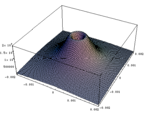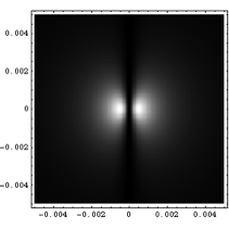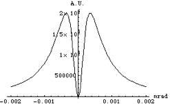 Fig. 4 – Distribuzione angolare della Òbremsstrahlung istantaneaÓ data dalla (8). LĠintensitaĠ eĠ arbitraria, mentre gli assi sono in [mrad]. La figura eĠ calcolata per un g di 2000, corrispondente ad un elettrone da 1 GeV.